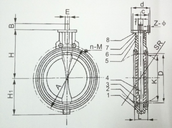 该系列蝶阀中线对夹式结构,采用蜗轮、蜗杆传动,旋转手轮时,凸轮随之转动,按预定位置将信号装置上触头压下或放开,相应输出“通”“断”电信号,显示蝶阀的启必状态。