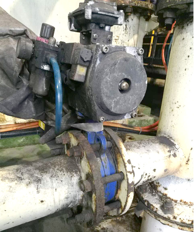 客户接到电话后说没有出现问题,是昨天我们的售后定期回访的时候给他打的电话,问他使用情况怎么样。然后他今天在现场想起昨天的售后回访电话,就随后拍了一张气动蝶阀的图片给我们,他说之前订的那批气动蝶阀到现在还在用,质量还不错,这用的有一年多的时候还没有出现什么问题。从下图我们可以看出虽然这台气动蝶阀的表面有很多的油脂和灰尘,但安装的还是挺牢固的,我们的售后人员也建议客户要定期维护气动蝶阀,这样可以延长气动蝶阀的使用寿命。